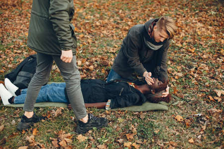 Friends man and woman helping african injured guy while hiking by forest, copy space
