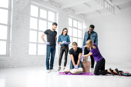 Group of young people practising to make artificial breathing with instructor and medical dummies during the first aid training indoors