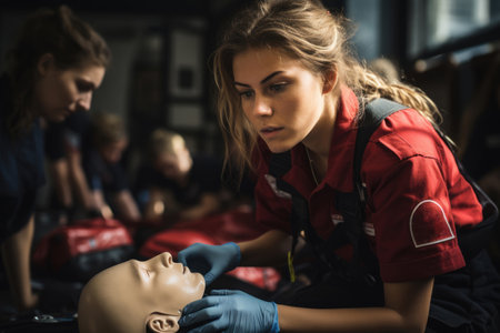 Details with the hands of a female student learning how to perform cardiopulmonary resuscitation (CPR) on a mannequin for educational purposes.