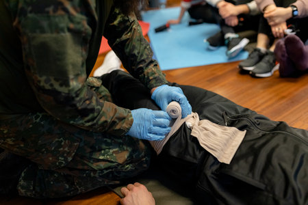 professional male instructor use tourniquet to prevent bleeding during first aid training, teach people to save the life