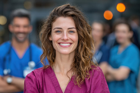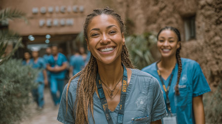 Female healthcare worker with curly hair smiles brightly in scrubs, surrounded by colleagues in a medical setting, highlighting collaboration and professionalism