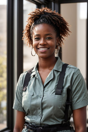 Smiling young female firefighter in yellow uniform, standing confidently in a professional rescue environment with warm expression.