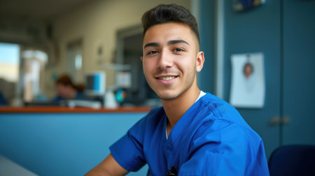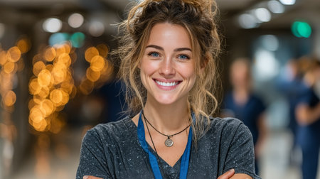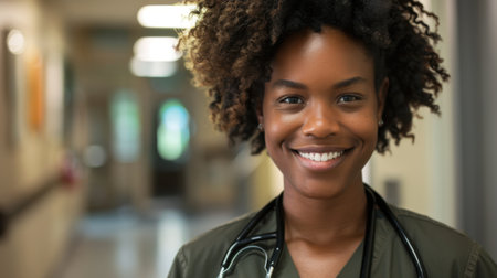 A cheerful healthcare professional exudes warmth and dedication in a hospital setting, embodying compassion and teamwork to enhance patient care and experience.