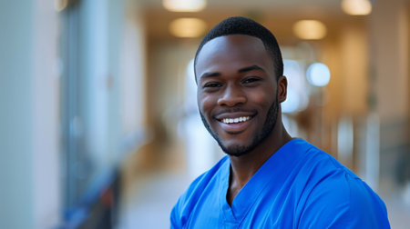 Portrait of a smiling African American male nurse in blue scrubs in a hospital corridor. Representation of healthcare diversity and medical professionalism.
