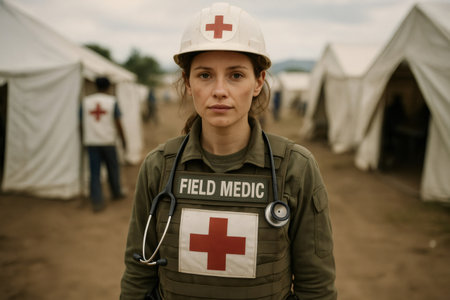 Confident female medical professional providing assistance in refugee camp, wearing protective gear and displaying red cross emblem