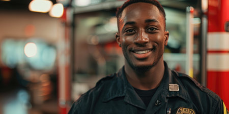 A young firefighter with short hair and brown eyes stands tall with arms crossed. The background features a fire truck, emphasizing his commitment and strength in this professional setting.
