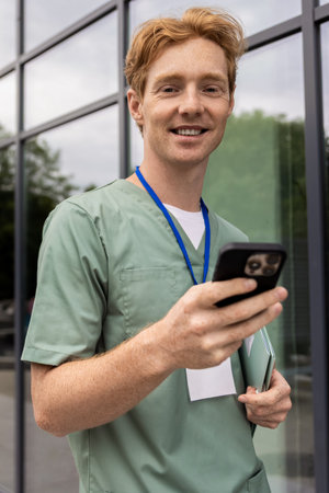 Ginger doctor standing near glass clinic building holding smartphone and scrolling