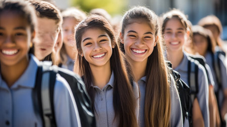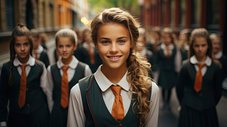 Portrait Of Teenage Students In Uniform Outside School Buildings. Generative AI