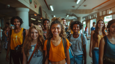 A diverse group of happy students standing together in a school hallway, smiling and looking at the camera. The image conveys friendship, unity, and positive energy.