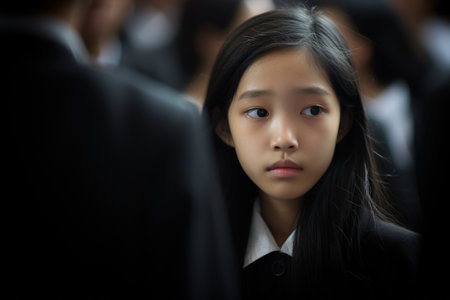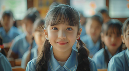 A young girl in a school uniform smiles brightly at the camera, surrounded by other students. This image captures the innocence and hopefulness of youth.