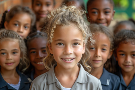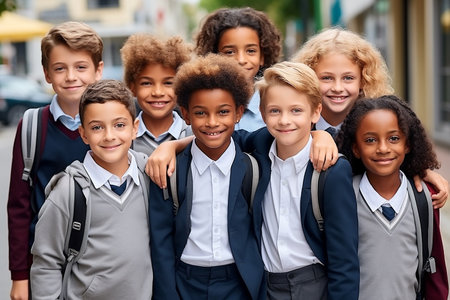 Portrait of smiling school kids standing in circle at school yard with look in camera. People portrait illustration. Generative AI art