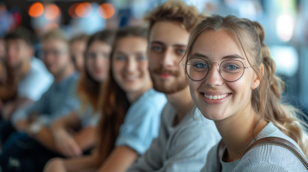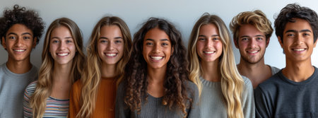 Group of diverse multiethnic young people standing in a row and smiling. Generative AI