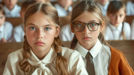 Portrait of two diligent girls looking at camera at workplace with schoolboys on background