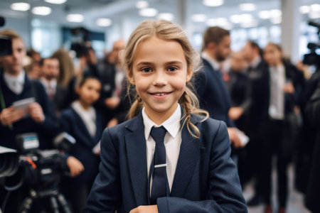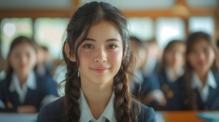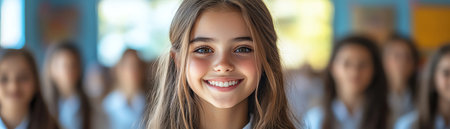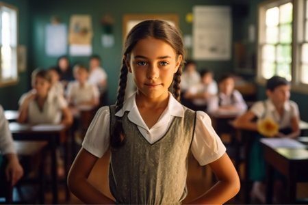 Smiling schoolgirl in uniform, standing in a bright classroom, natural light