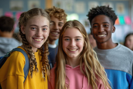 group of four happy teenage students in bright clothes standing in classroom. ai generated