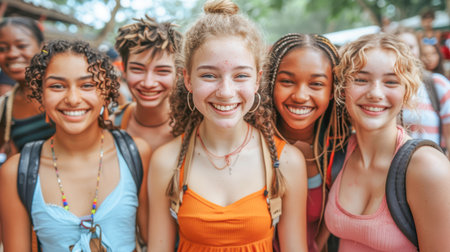 Five smiling and friendly multi-ethnic teenagers pose together for a photo. This image represents friendship, diversity, modern youth culture, and school life.
