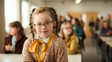 Portrait of a red-haired schoolgirl with Down syndrome wearing glasses and pigtails, sitting at a desk and looking at the camera in a bright classroom with blurred classmates