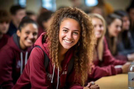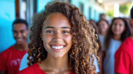 A girl with curly hair is smiling and wearing a red hoodie. She is surrounded by other people, some of whom are also smiling. Scene is happy and friendly