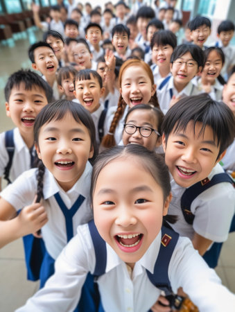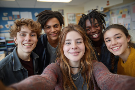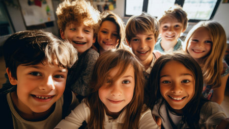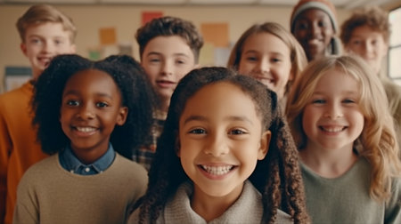 Children from a varied junior high school group smile for the camera while seated in class. Multiethnic cool youngsters boys and girls buddies grinning as they pose for a group selfie. GENERATE AI