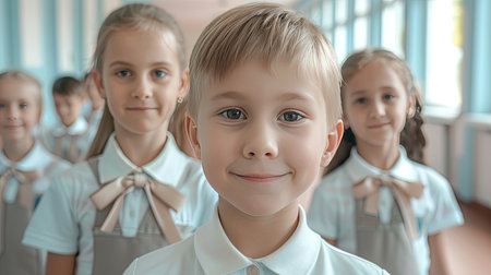 Group portrait of elementary school kids in school corridor. AI Generated.