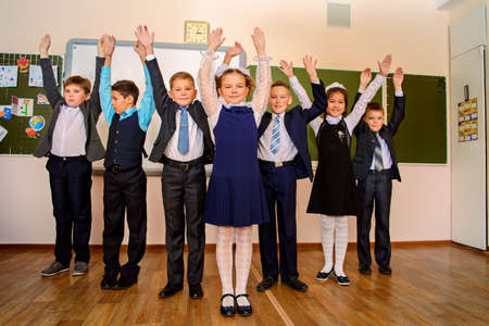 Group of happy classmates in school uniform posing together at a classroom. Education.