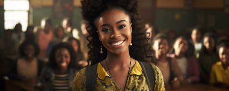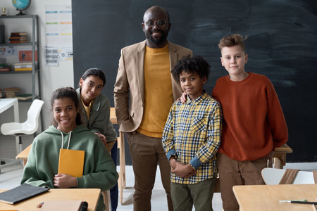 Portrait of African American teacher smiling at camera together with his students while they standing in the classroom