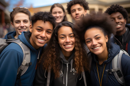 Group of cheerful multiethnic high school students are smiling and having fun together outside