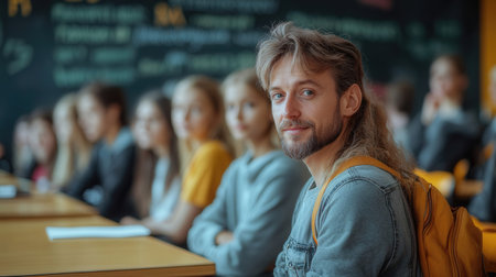 Portrait of a happy handsome male teacher in the classroom. Teacher