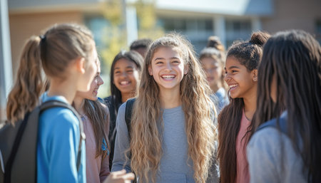 Smiling Young Girl In School Uniform Surrounded By Friends
