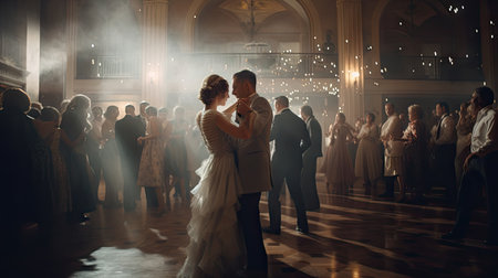 Under soft golden lighting, a couple shares their first dance as newlyweds, surrounded by joyful guests applauding their love. The enchanting atmosphere enhances their intimate connection.