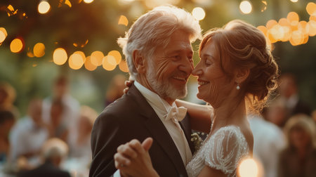 A joyous couple senior sharing a dance at an outdoor wedding celebration. The golden evening light and festive string lights create a warm and romantic atmosphere for this special moment.