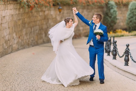 Wedding couple in love. Bride and groom dancing on the street.
