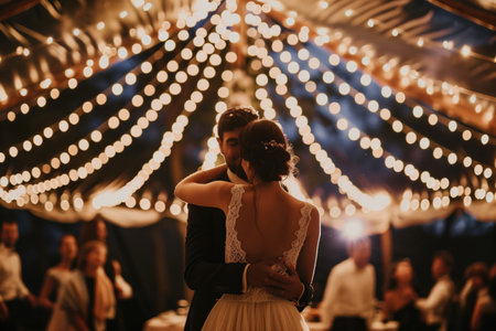 Bride and groom sharing a romantic dance under a canopy of twinkling lights at night. Concepts of love, weddings, and intimate celebrations.