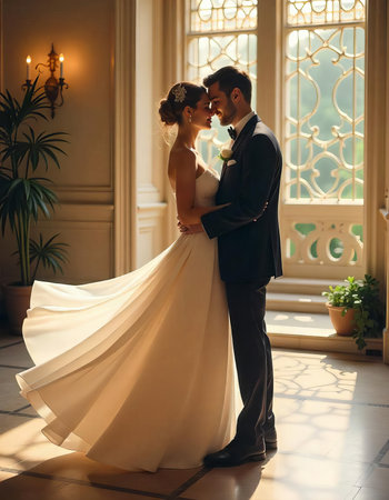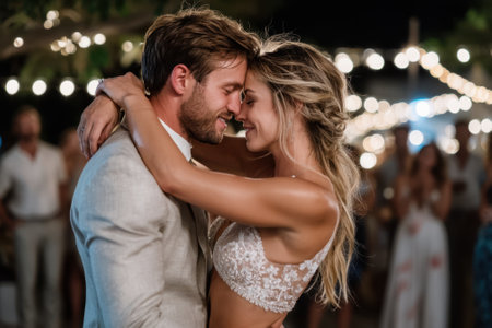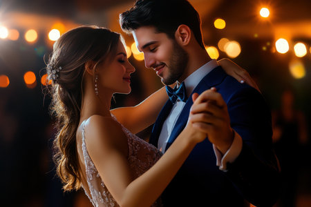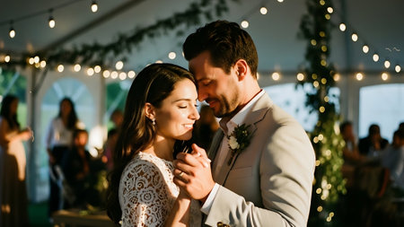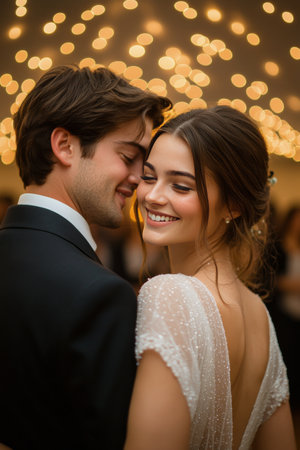 A newlywed couple shares a tender moment while dancing closely during their wedding reception. Soft lights create a romantic ambiance as they smile at each other, celebrating their love.