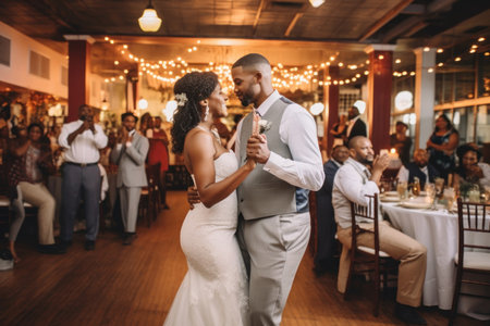First wedding dance of african american newlywed couple. Generative AI.