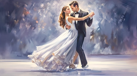 cartoon, young couple in social clothes dancing on ice on ice skates, figure skating, made with Generative AI