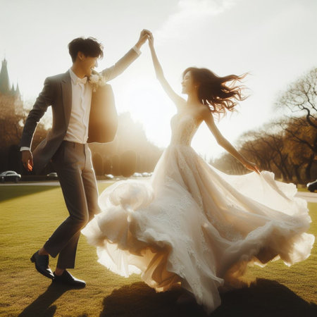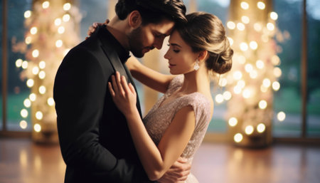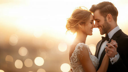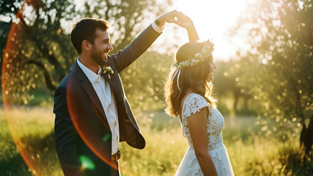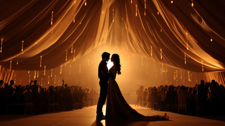 Backlit scene with a newlywed couple dancing. sensitivity and a happy family Generative AI and newlyweds