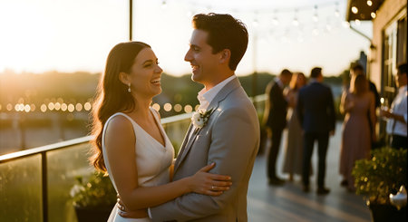A happy couple embracing on a rooftop during a beautiful sunset wedding reception