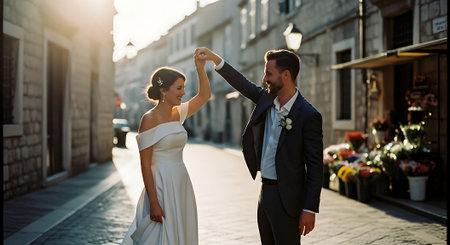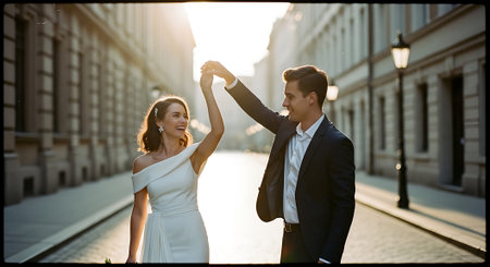 A newlywed couple dances joyfully on an empty street during sunset, with the bride in a white gown and the groom in a suit and tie.
