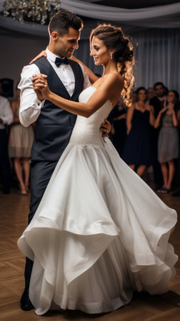 Happy newlyweds dance in front of guests. Generative AI