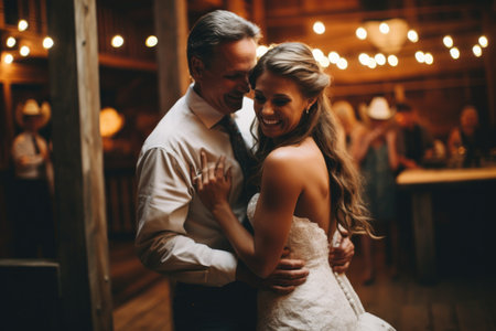 Wedding couple embracing each other in the old wooden house, A father-daughter dance at a barn wedding, AI Generated