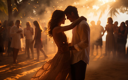 Latin American Dancing Couple at a Music Party in Sunset's Golden Hour. Dance Couple from Latin America Full-Length Among the Crowd at a Sunset Music Party