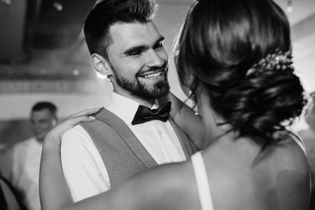 Portrait of newlyweds first wedding dance. Just married couple dancing in darkness. Groom holds brides hand dancing with her in the middle of restaurant. Happy bride and groom and their first dance.