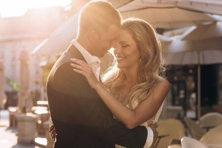 Beautiful bride and groom on the background of the setting sun.