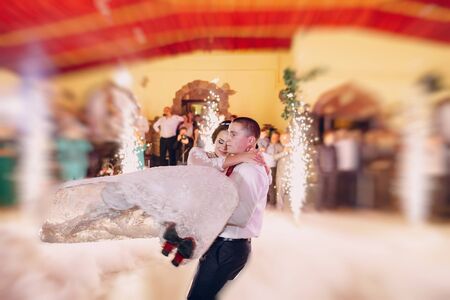 stylish groom lifting happy bride and dancing at wedding reception in light. gorgeous wedding couple performing first dance in restaurant. newlyweds, emotional moment. space for text