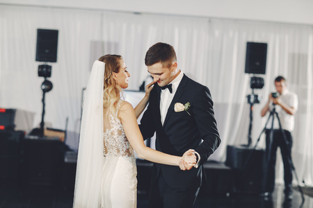 Wedding couple dancing in the restaurant. Bride and groom in a wedding dress