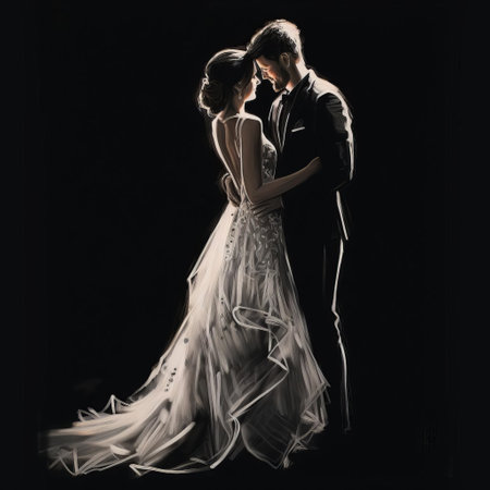 bride, adorned in a stunning white gown, stands elegantly against a dramatic black background in this exquisite hand-sketch wedding portrait, showcasing the artist's mastery of bright, bold lines and delicate shading, capturing the magic of the special day in a unique and romantic way., ai generated