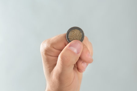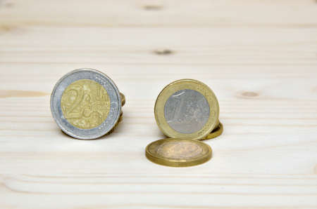 Two euro coin standing erected near to stack of money arranged in column on a brown wooden table from close up. Detailed macro photograph of a metallic cash. Piles of money.