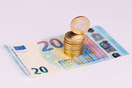 A row of euro coins lies atop a 20 euro bill, showing one coin standing vertically, all set against a clean white background