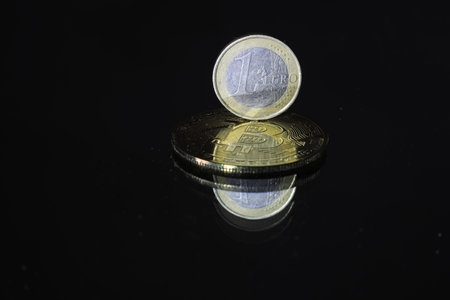 Euro coins isolated with pitch black background, reflecting in black metallic surface. Money on a very dark table.